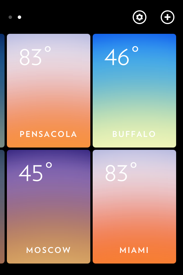 Solar manages multiple cities in a card-style interface. The cards can be moved around and deleted just like apps on the homescreen. The app gets information from Weather Underground, so there shouldn't be a problem with missing area information.