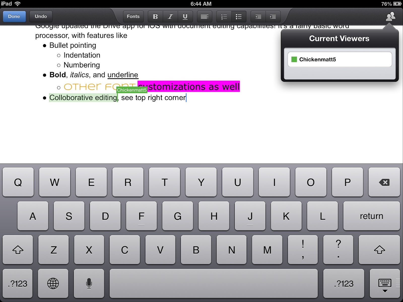 Not only can you edit documents, you can see when others are editing the same document as well. I believe there's also a chat built in for collaborators too. Along with the new editor, presentation files are now displayed more smoothly now, and you can create documents and folders, as well as upload photos from the Camera Roll.